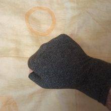 The gloves are designed with a left and right hand, rather than a interchangeable shape, which means that they fit properly around the thumb. I really like how the length of the fingers on the gloves comes up so high, providing extra warmth and comfort for the middle knuckle and a bit of the top knuckle too. Keeping the finger tips exposed means that I can type and pick things up without worry. Because the fabric is mostly cotton, it breathes well and doesn’t leave you with clammy hands. When needed, hand wash in cold water and air dry so that the elasticity doesn’t go out of them, and they won’t shrink.