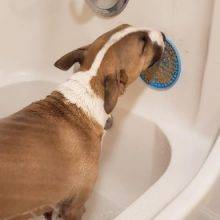 This was difficult to get to stay in place on the tile wall. It didn’t make Bath time any easier to have this falling off and smearing peanut butter on the pup when fell. It was a pain to clean. Probably cleans easily in a dishwasher. But hand washing required lots of soaking and scrubbing, multiple times. More trouble than it was worth.